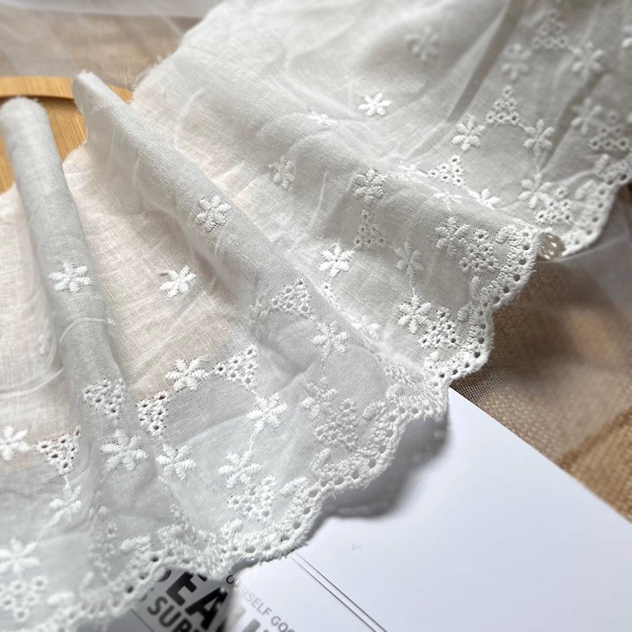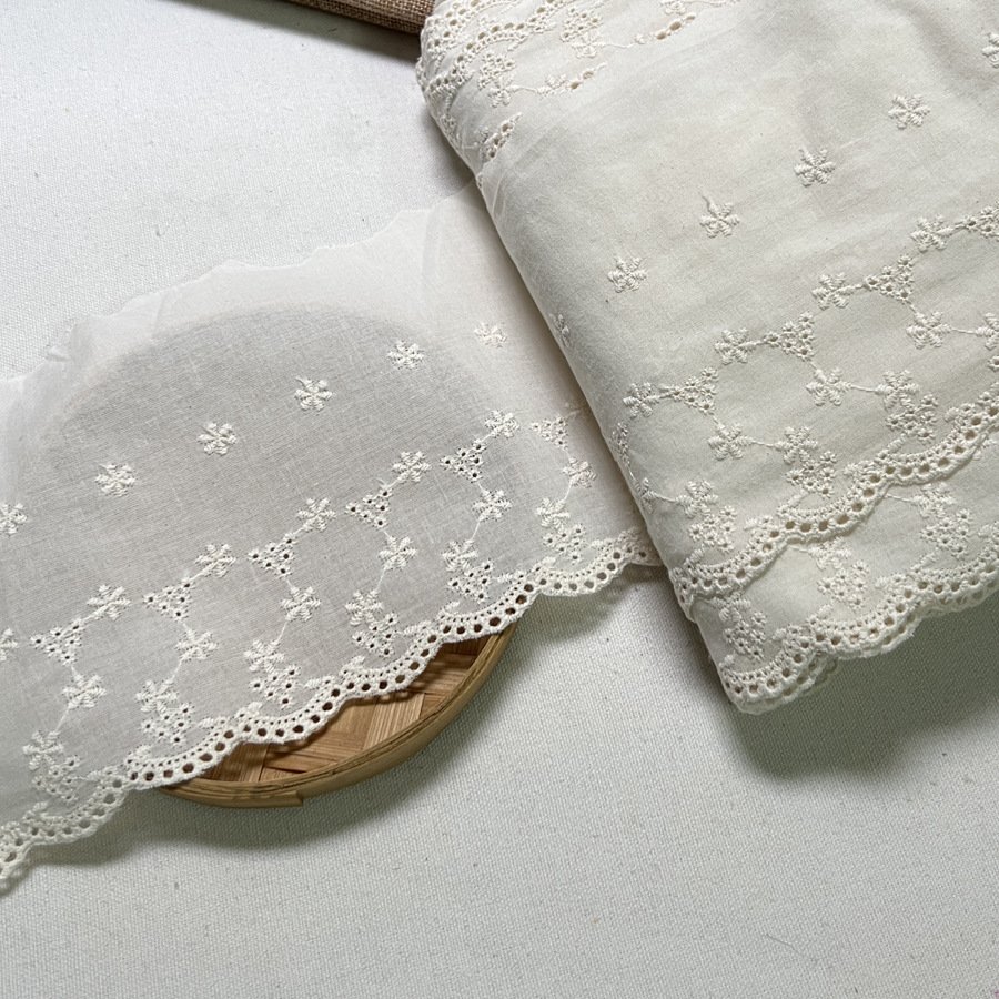 This 13.5cm Cotton Embroidered Lace Trim is a wide, beautifully detailed lace with scalloped floral embroidery, perfect for adding a touch of elegance to garments, wedding dresses, and creative sewing projects. Made from soft cotton, it combines comfort with timeless style.