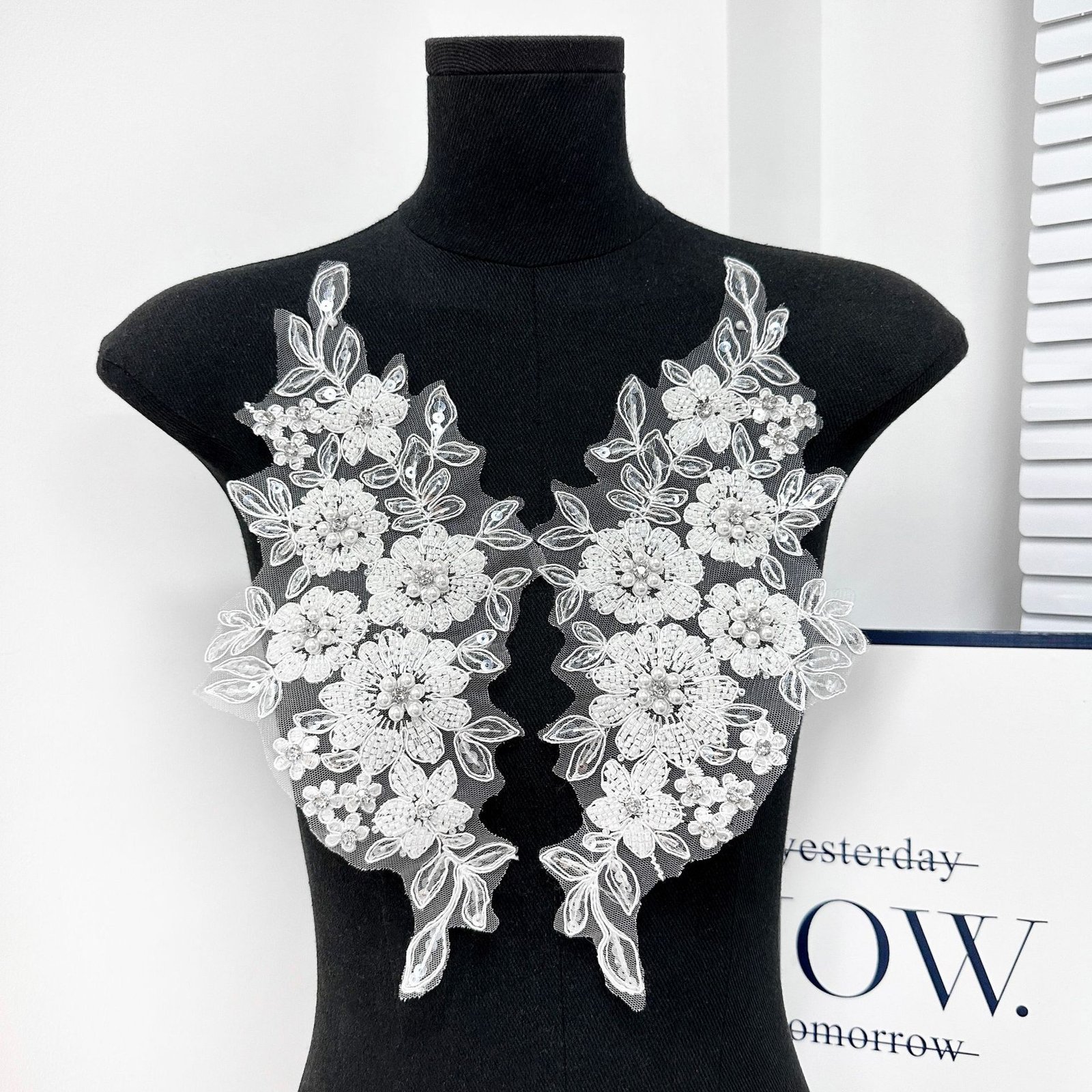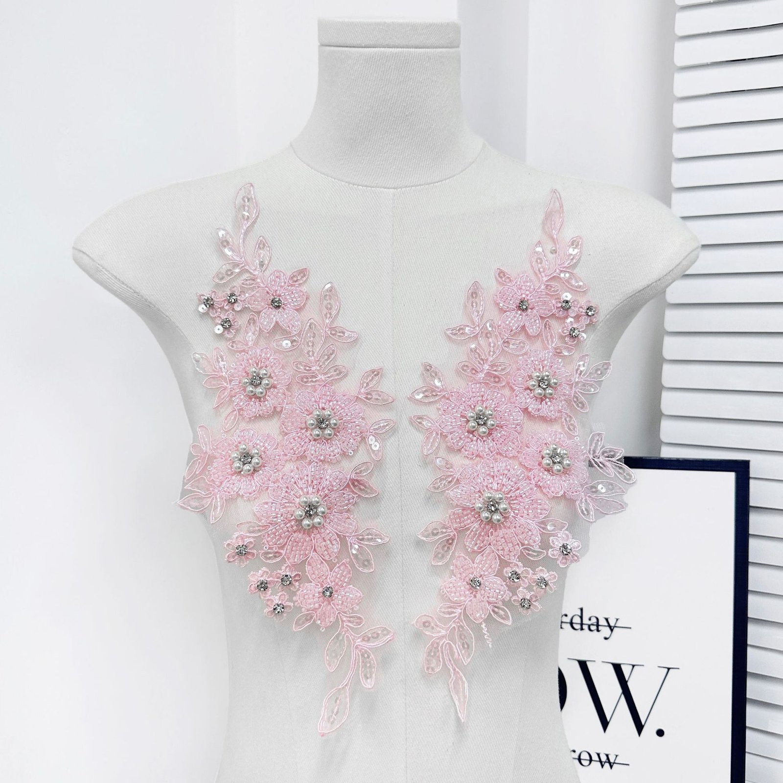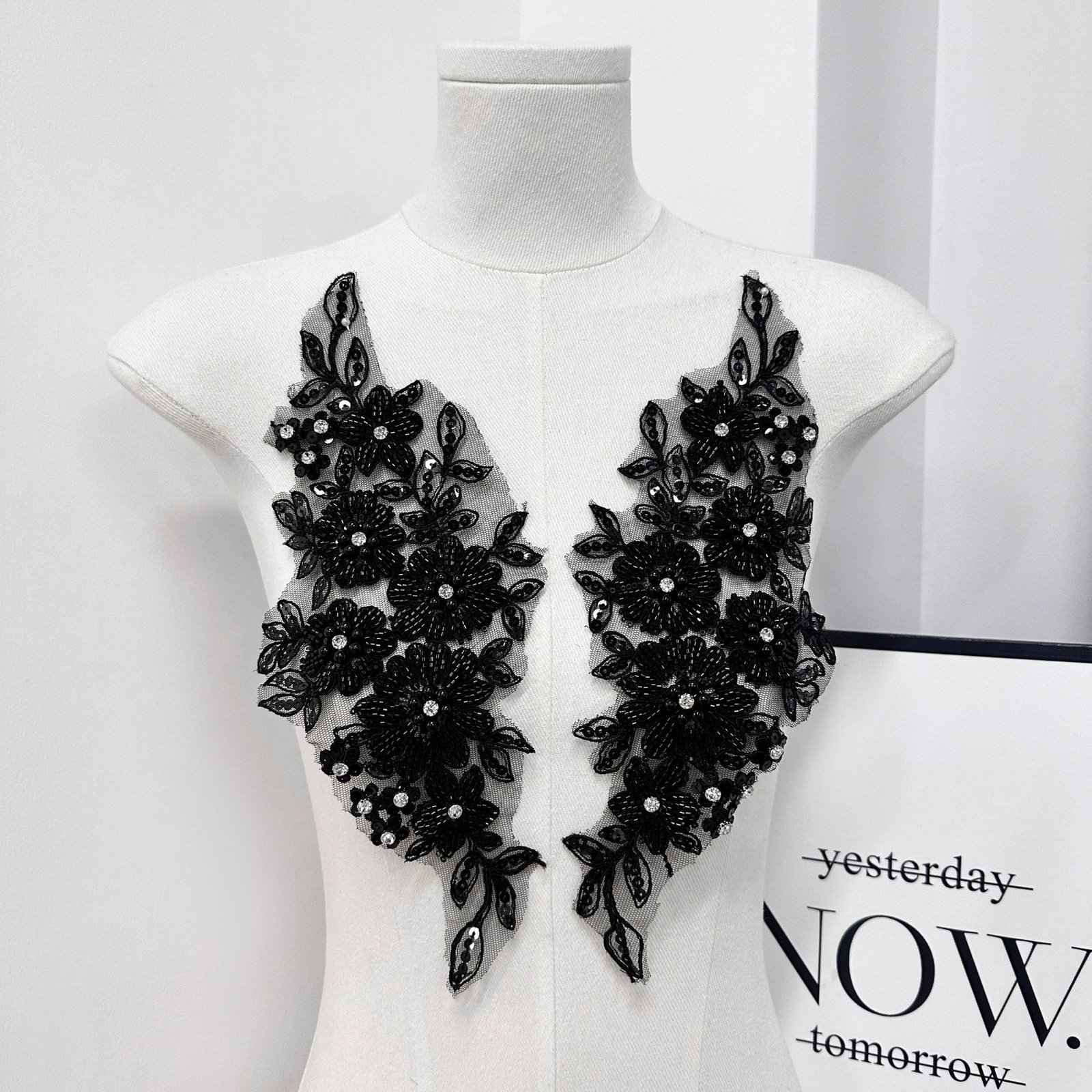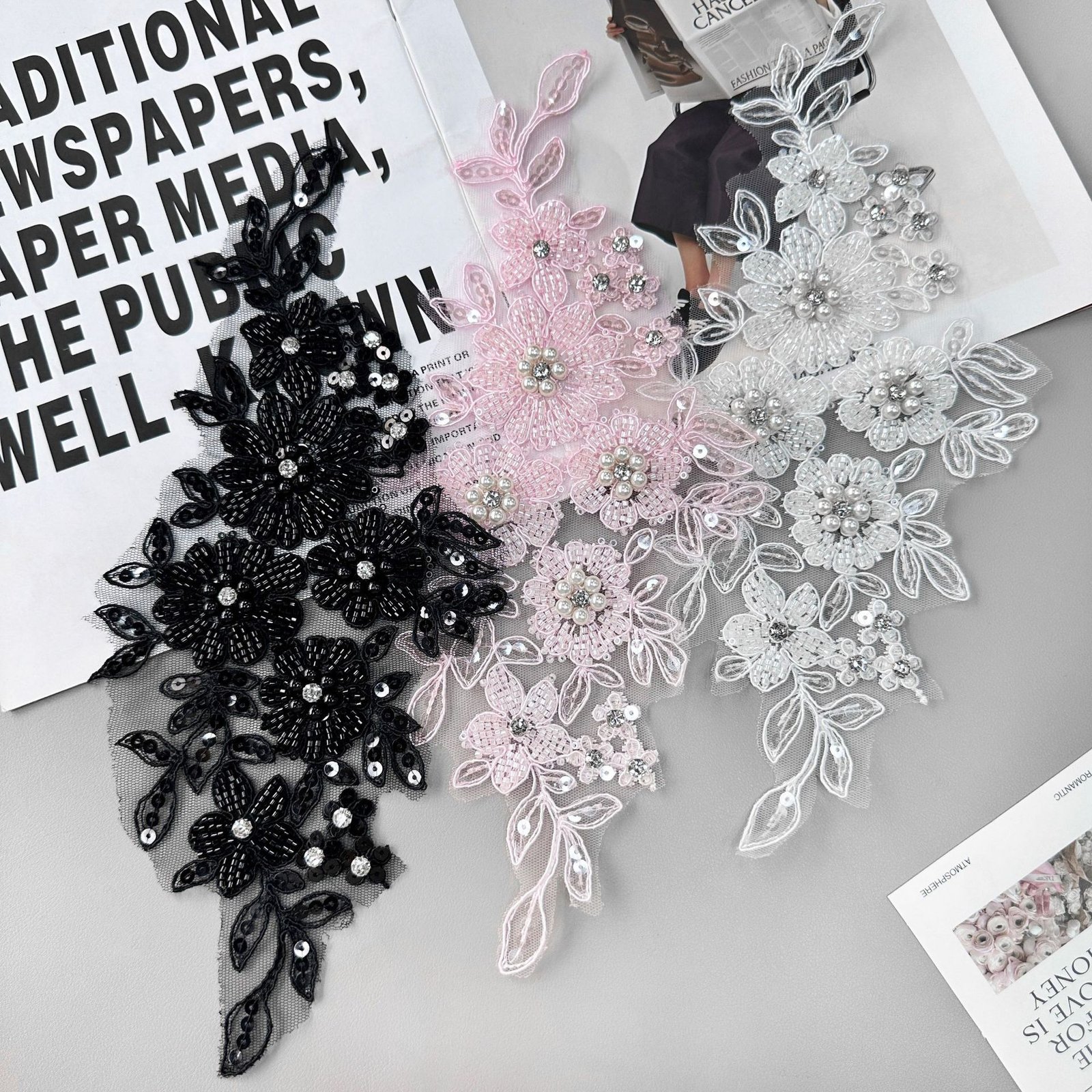 Available in black, white, and pink, these appliqués are ideal for adding visual focus and structure to garments, accessories, or custom design projects. The raised floral construction enhances depth and elegance without excessive weight, making it suitable for both statement areas and detailed embellishment work.