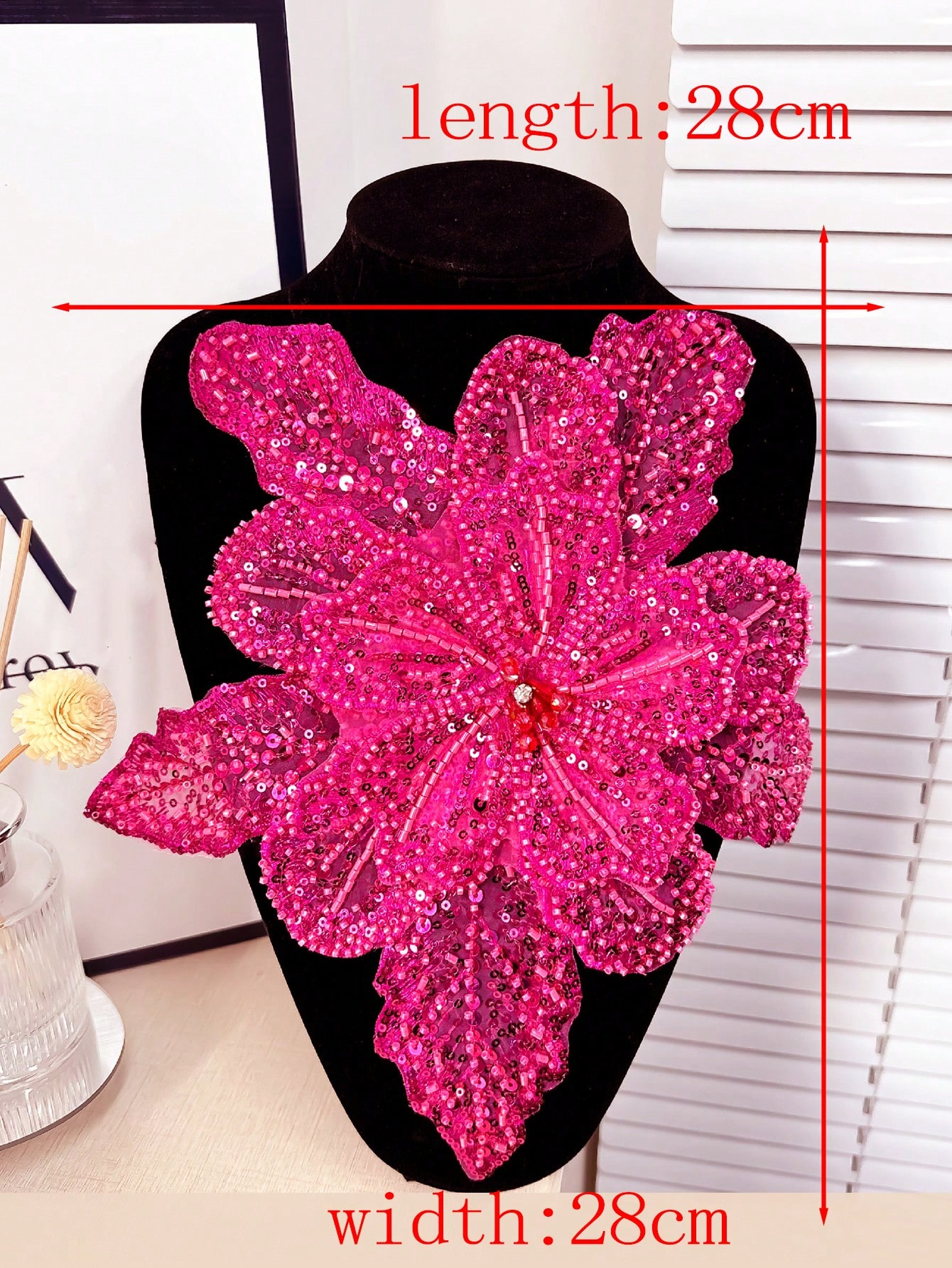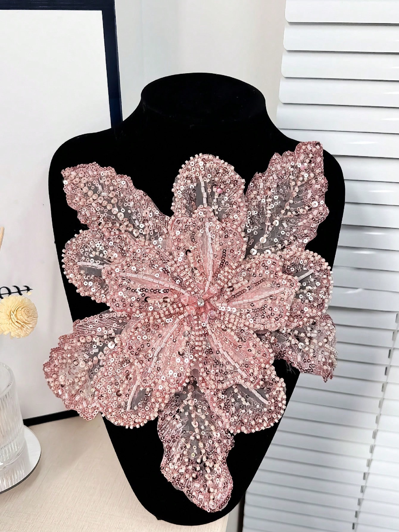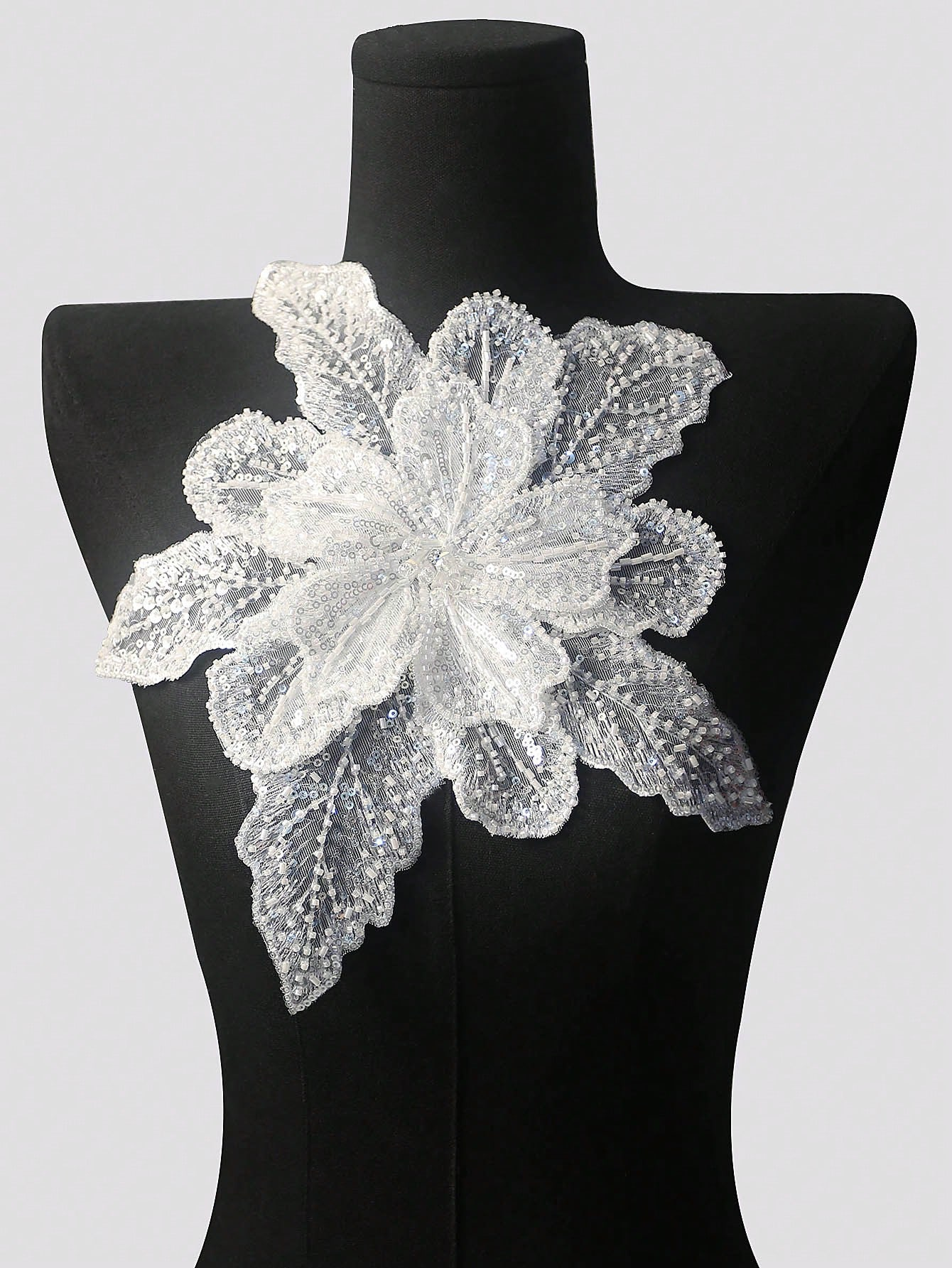 The flower silhouette is dramatic yet balanced, making it ideal as a focal embellishment rather than a secondary trim.