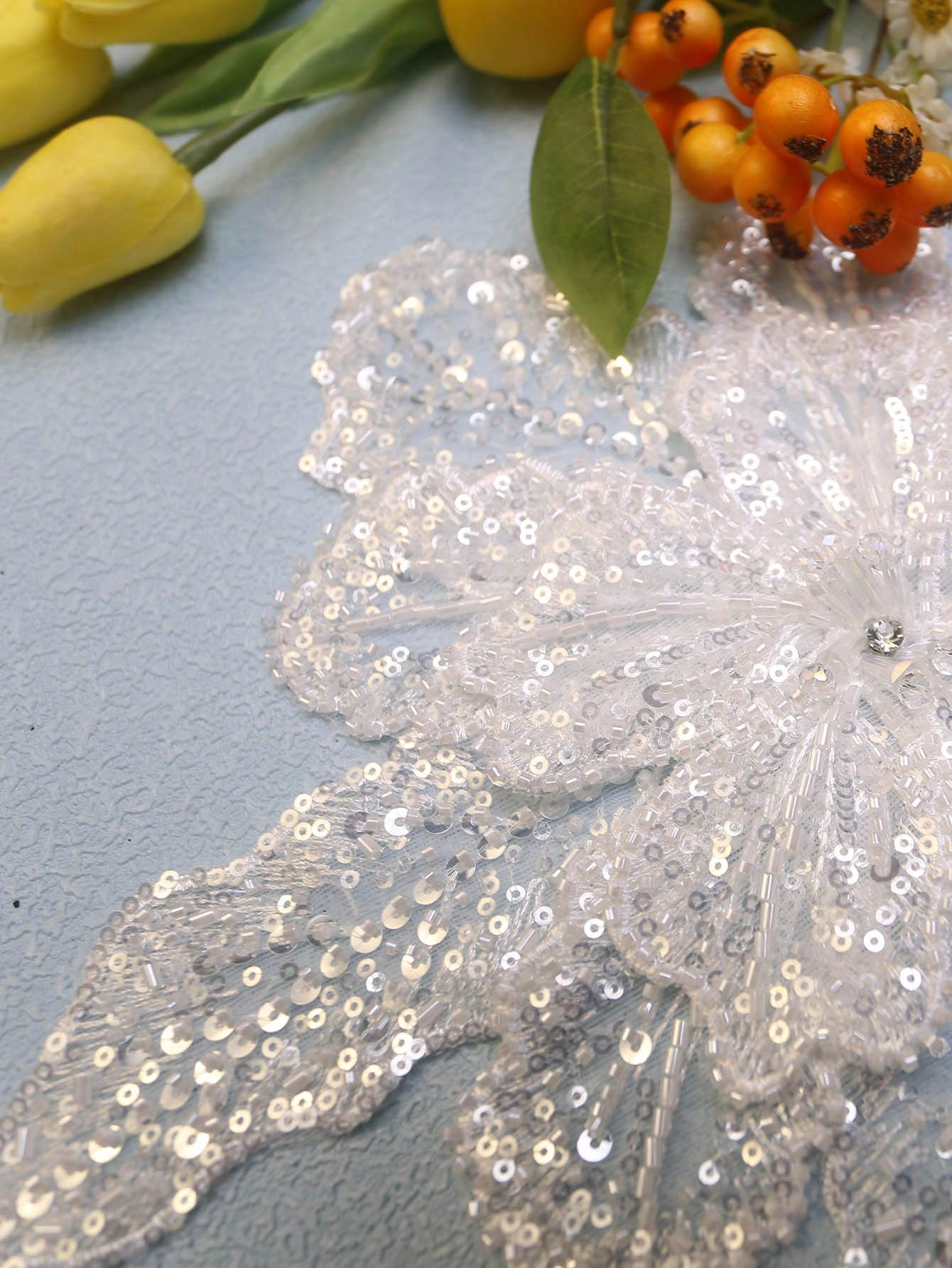 Each petal is carefully embroidered with high-density sequins and fine bead detailing, arranged in a radiating pattern from the center. The layered structure enhances volume and light reflection, allowing the applique to catch light from multiple angles while maintaining flexibility for sewing and shaping.