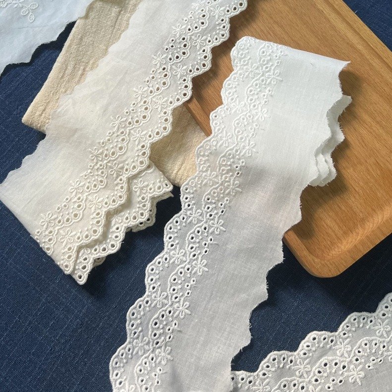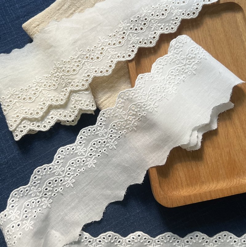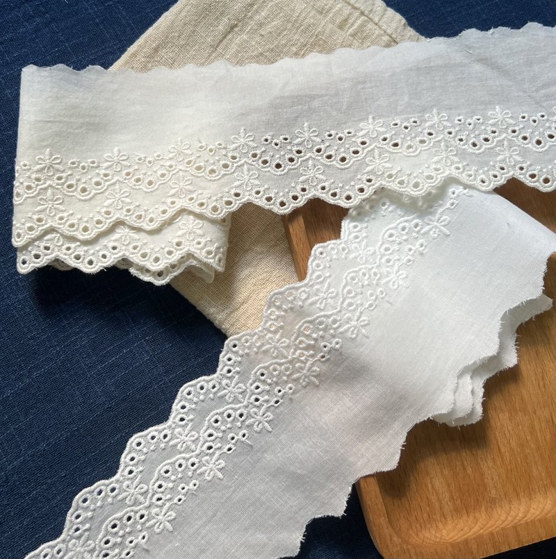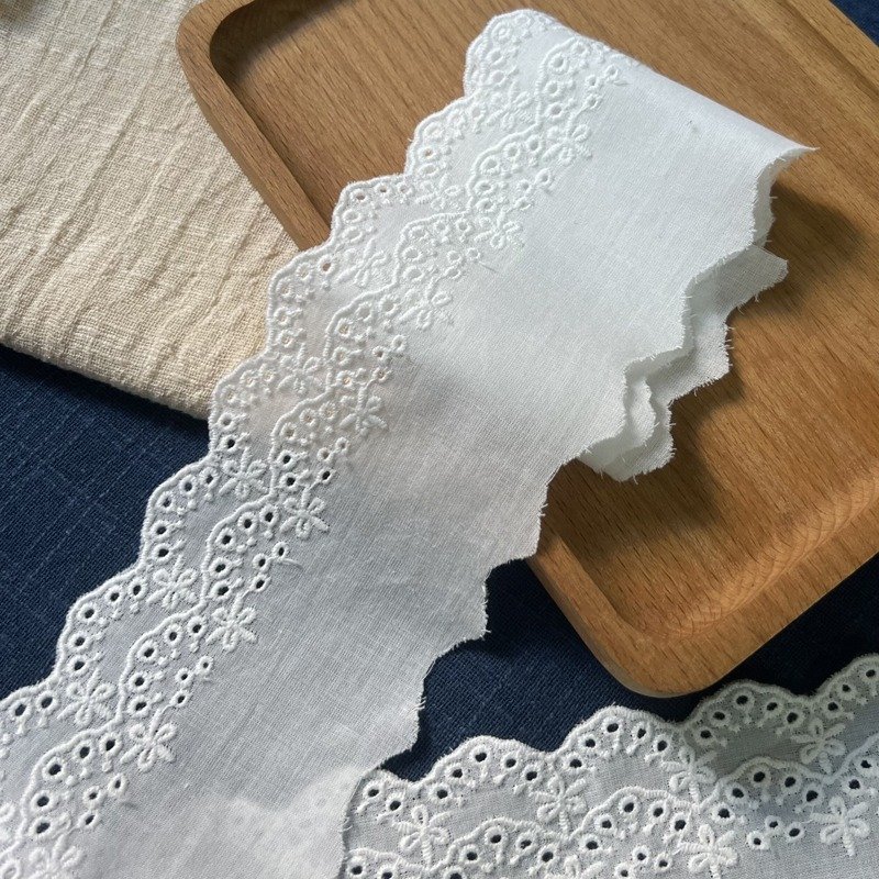 This 6.8cm Cotton Embroidered Lace Trim is designed with elegant scalloped edges and fine eyelet embroidery, bringing a touch of classic charm to both clothing and craft projects. Soft yet durable, this lace is ideal for those who love natural cotton textures combined with timeless embroidery patterns.