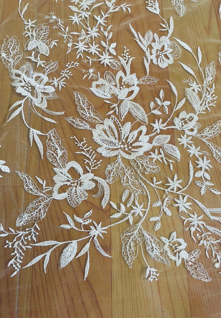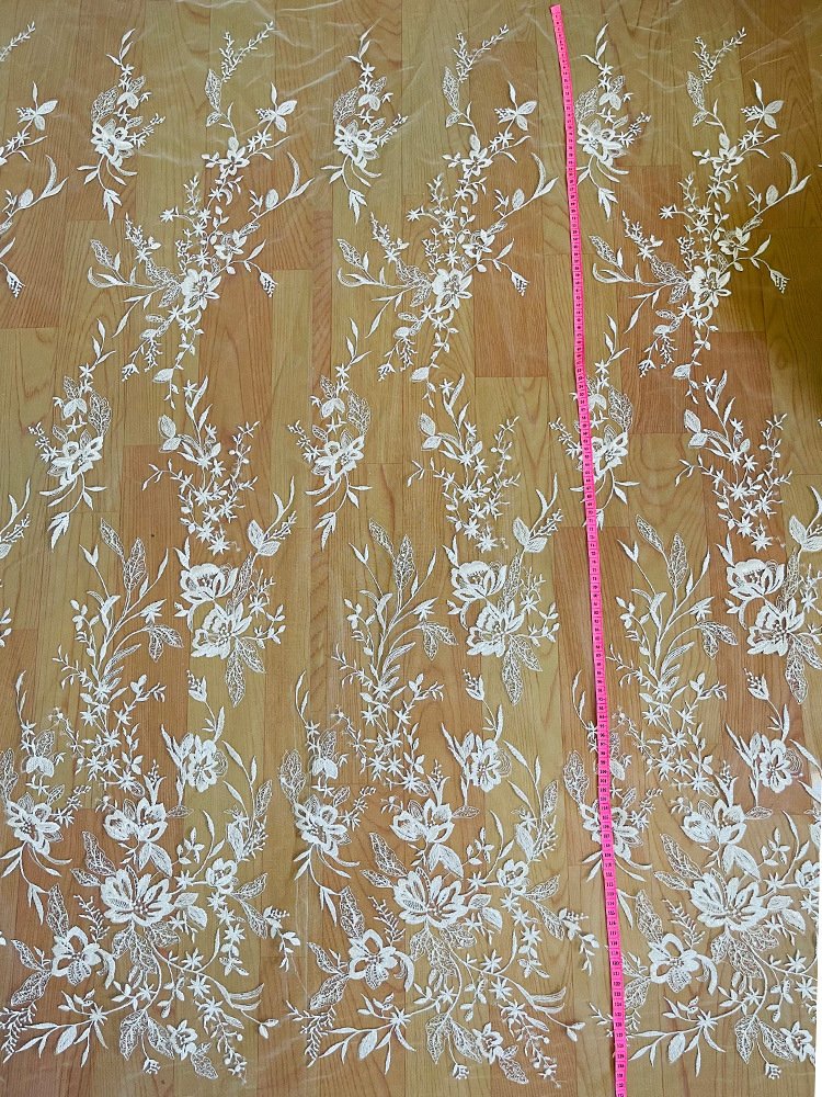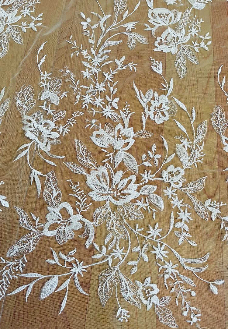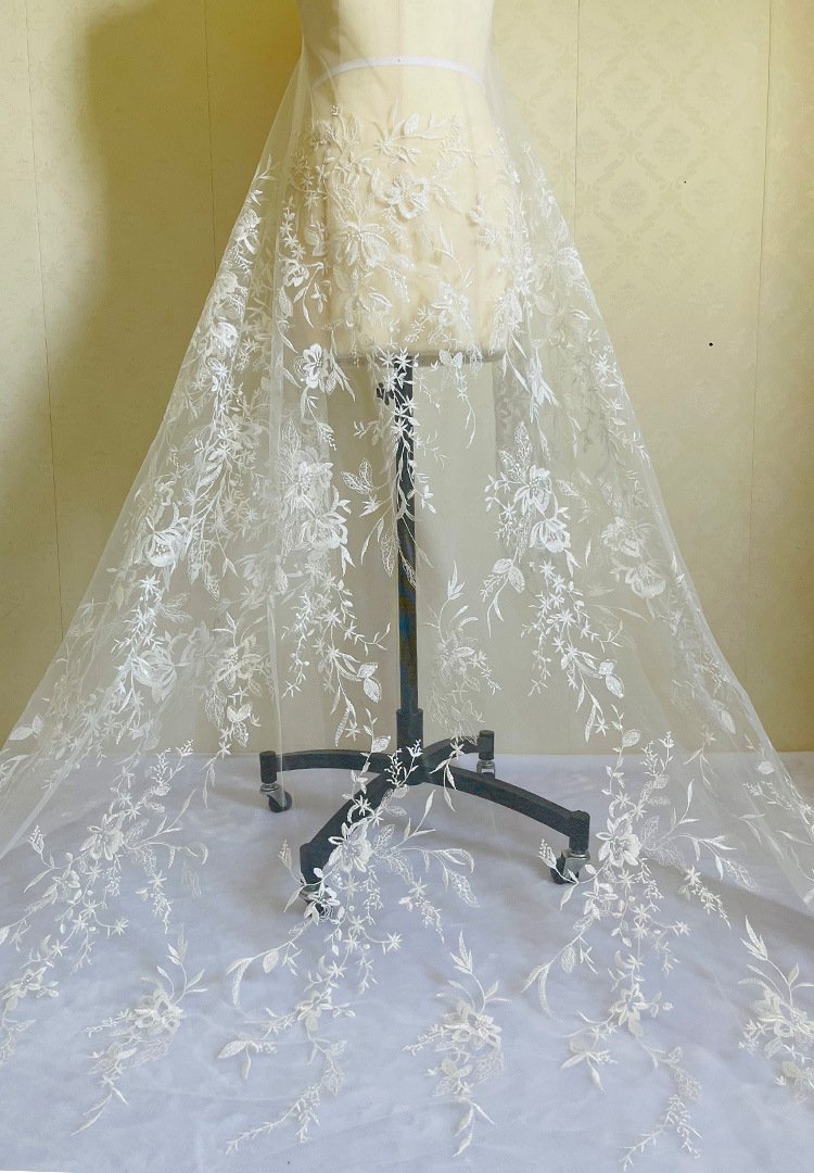 This embroidered lace fabric (1.25m wide, sold by yard) features elegant floral patterns on soft mesh, offering a refined and luxurious style. Perfect for bridal couture, evening wear, and DIY handmade creations, it inspires both designers and hobbyists.