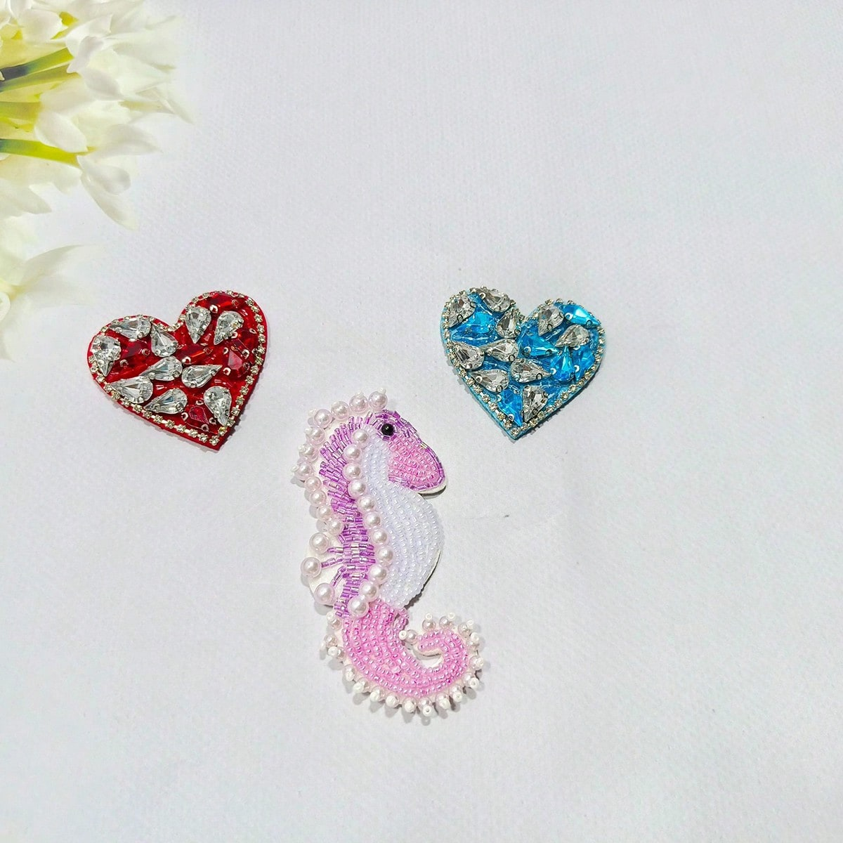 Bring a touch of the ocean and tropical vibes to your fashion creations with this Handmade Beaded Ocean Life Fabric Patch Set. Featuring a seahorse patch, palm tree applique, and sparkling heart embellishment, each piece is carefully crafted with beads, rhinestones, and pearls for a dazzling effect.