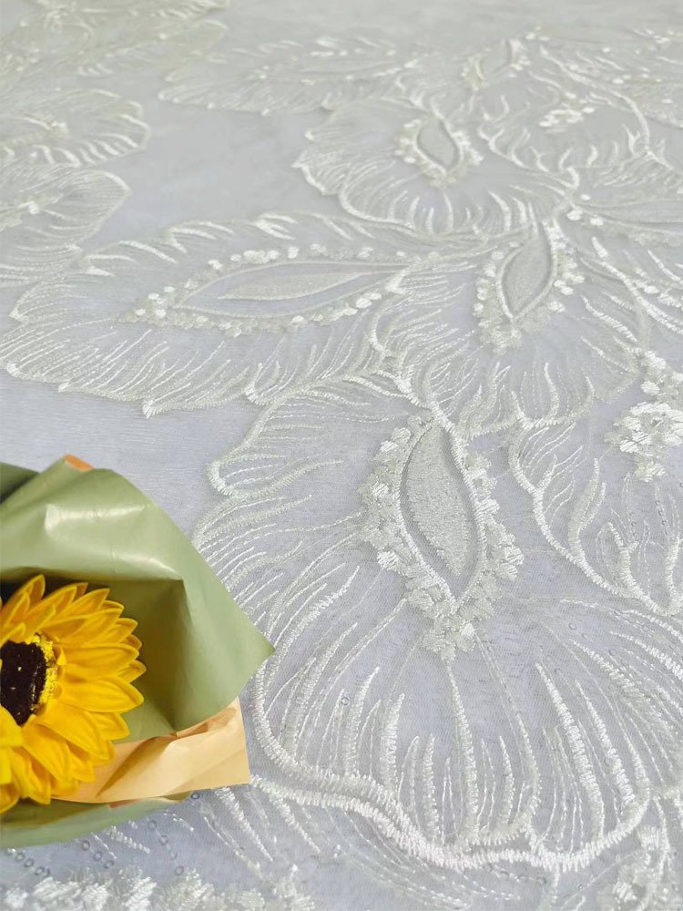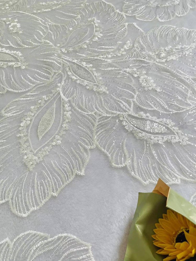 Large Leaf Sequin Embroidered Lace Fabric – 123cm Wide Mesh Material for Wedding Gowns, Dresses & Couture Sewing