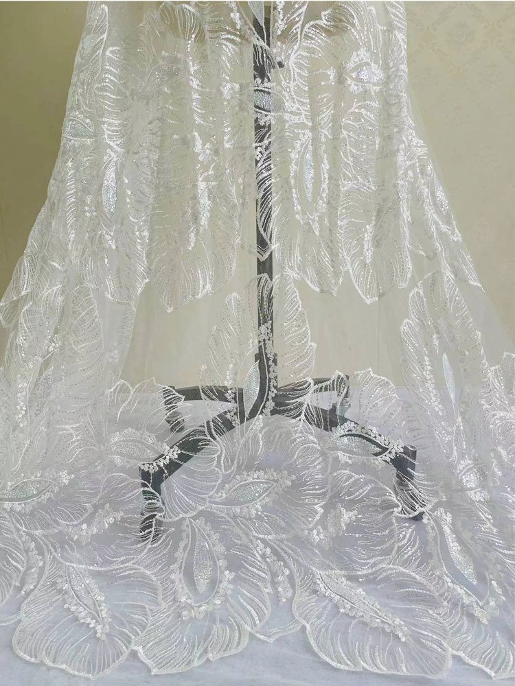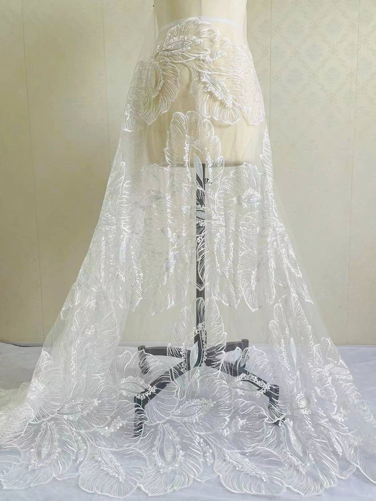 Luxury Leaf Pattern Sequin Lace Fabric – Premium Embroidered Mesh for Bridal Gowns, Skirts, Evening Dresses, and Abaya Design