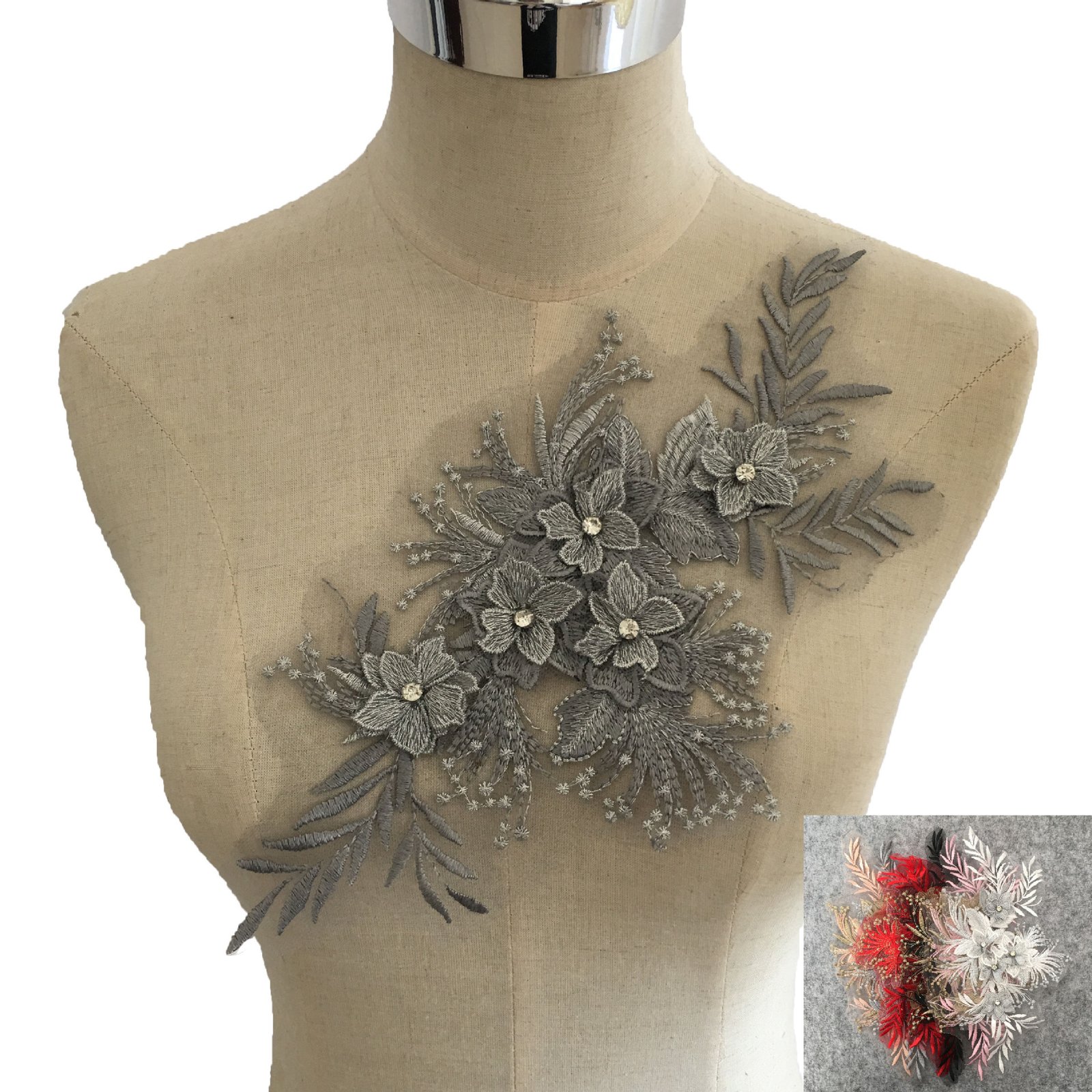 The neutral grey tone offers strong versatility, allowing this applique to blend seamlessly into modern fashion designs as well as handcrafted projects.