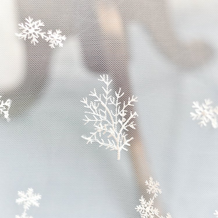 This snowflake pattern lace fabric by meter (1.3m wide) captures the elegance of winter with delicate embroidery on sheer mesh. Perfect for bridal couture, evening dresses, and DIY handmade creations, it brings a seasonal sparkle to any design.